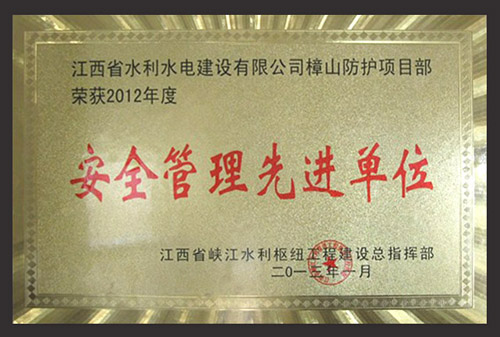 2013年2月,江西省峽江水利樞紐工程建設總指揮部授予我公司樟山防護工程項目部“2012年度安全管理先進單位”榮譽稱號,項目管理人員彭紅軍、鄧敏被評為峽江水利樞紐“安全生產先進個人”。