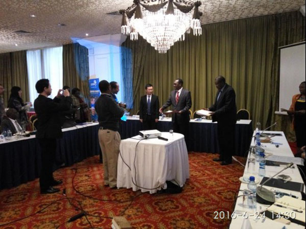 最后董國鋒處長(zhǎng)及肯尼亞商務(wù)部首席秘書Dr Chris Kiptoo共同為各國代表團(tuán)成員頒發(fā)此次培訓(xùn)的結(jié)業(yè)證書。本次活動(dòng)圓滿落幕。當(dāng)晚,公司董事、副總經(jīng)理、海外公司總經(jīng)理黃鄭民及肯尼亞公司副總經(jīng)理彭紅軍、經(jīng)營(yíng)部副經(jīng)理丁晨陽一同出席了國際小水電中心的晚宴。