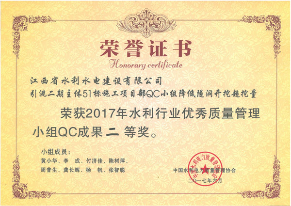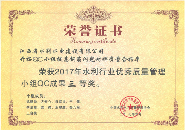 近日,中國水利電力質量管理協會水利分會在湖南省長沙市,舉辦了2017年水利行業優秀QC小組成果發表會,并在本次發表會上發布了206項QC成果。本次成果發表會上,我公司發表的4項QC成果中, 1項QC成果獲一等獎,2項QC成果獲二等獎,1項QC成果獲三等獎。公司已連續3年獲得水利行業優秀QC小組成果獎。