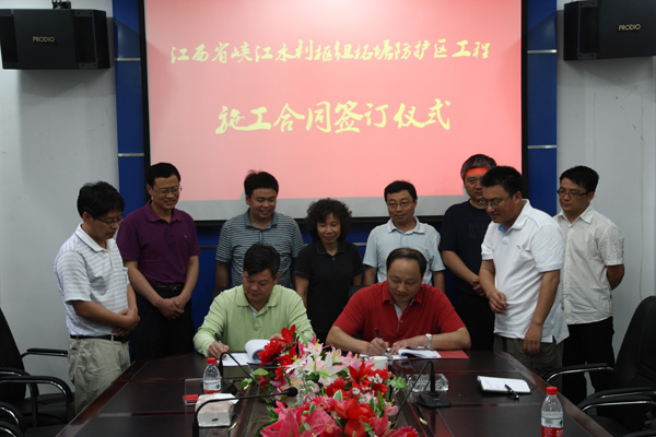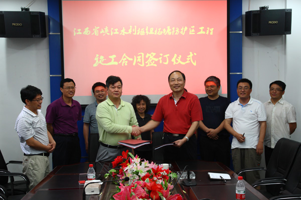 公司董事長總經(jīng)理王元旦與峽江水利樞紐總指揮吳義泉簽訂施工合同