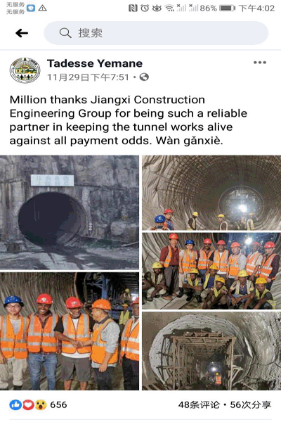 參觀結束時,Tadesse先生由衷感謝大家的辛勤付出,對項目部順利完成隧洞首倉襯砌砼表示高度贊許,并相信項目部一定能保質保量完成隧洞二期襯砌施工。Tadesse先生還在Facebook(臉書)平臺分享了本次隧洞參觀的經歷,并表達了對我公司作為戰略合作伙伴的充分信任。