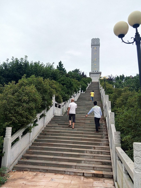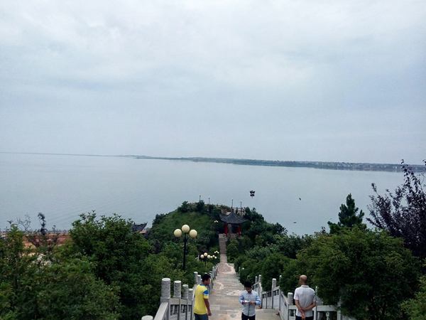 除了饒娥像,其對(duì)面的斗笠山也是美景所在之處。入山前,首先看到的是一條由青石板鋪成的臺(tái)階,臺(tái)階蜿蜒陡峭,兩側(cè)是漢白玉雕欄,欄上雕龍繪鳳,栩栩如生。抬頭仰望,只見臺(tái)階盡頭是一座高聳的石碑,燙金而書“天下第一碑”幾個(gè)大字。一路走走停停到了石碑前,眼前豁然開朗,放眼瞭望,到處一片茫茫水面,碧波蕩漾,翻起碎玉點(diǎn)點(diǎn)。窮極目力,水天一線之間,一座三角錐狀燈塔若隱若現(xiàn),“浩渺鄱湖水接天,波翻浪涌競(jìng)爭(zhēng)先;連江通海胸懷廣,滋養(yǎng)生靈歲復(fù)年。”余老的《鄱陽頌》誠(chéng)不欺我。臺(tái)階中央又有一小平臺(tái),連接至一片紅墻黃瓦的走廊,廊前紅墻上鑲嵌著墨色的石板,上面刻著一些當(dāng)代大家對(duì)鄱陽湖的見聞和贊譽(yù),筆走龍蛇,字體蒼勁,令人賞心悅目之時(shí)不免肅然起敬。走下斗笠山,已經(jīng)接近傍晚,金日西斜,站在饒娥像后眺望,湖面一片金鱗銀濤,美如油畫。