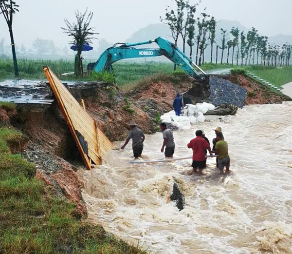 進入7月以來,昌江河流域普降暴雨,橋溪水河水位大漲。7月7日,公司接到業(yè)主汛情通報,已完工驗收工程多處出現險情;汛情就是命令,時間就是生命,公司迅速組建了一支裝備精良、經驗豐富的專業(yè)搶險突擊隊,由副總經理曾朝文、總經理助理杜凌帶隊,連夜奔赴浮梁抗洪一線,組織設備、人員、材料進場,進行搶險救災工作。